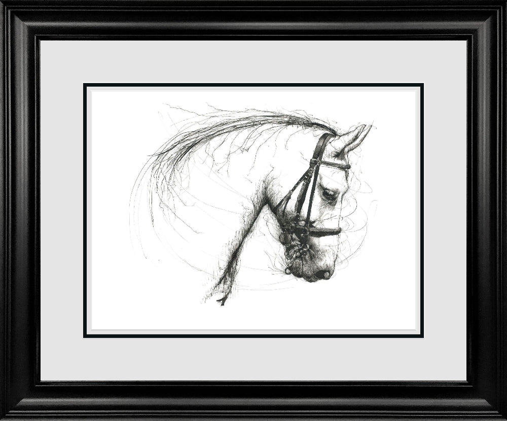 Quiet Power is a beautifully expressive equine study by renowned British artist Scott Tetlow, showcasing his signature calligraphic style. Created with dynamic, flowing lines and subtle tonal shading, the artwork captures the gentle strength and quiet poise of a horse in profile. Tetlow’s distinctive technique, influenced by his training in traditional calligraphy, brings a sense of movement and immediacy to the piece. Fine, gestural marks build into areas of detail, giving the horse both structure and spirit while maintaining an elegant, sketch-like freedom.