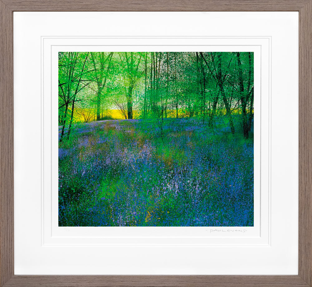 Springtime by artist Paul Evans is a landscape piece, a peaceful forest in Spring sets a colourful scene of fresh green leaves, the meadow full of the most striking purple flowers capturing a calm and peaceful moment. Celebrated British landscape artist Paul Evans is known for his contemporary approach to depicting the natural scenery of the British Isles, blending modern techniques with a deep appreciation for nature’s timeless beauty.