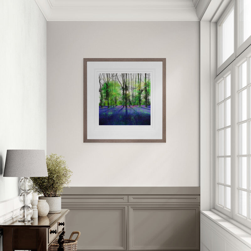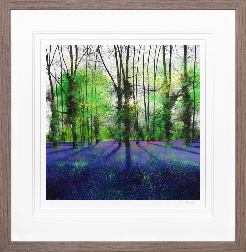 Sunburst and Bluebells by artist Paul Evans is a landscape piece, a peaceful forest in springtime sets a colourful scene of fresh green leaves, the forest floor glistens with a carpet of purple blooms capturing a calm and peaceful moment. Celebrated British landscape artist Paul Evans is known for his contemporary approach to depicting the natural scenery of the British Isles, blending modern techniques with a deep appreciation for nature’s timeless beauty.