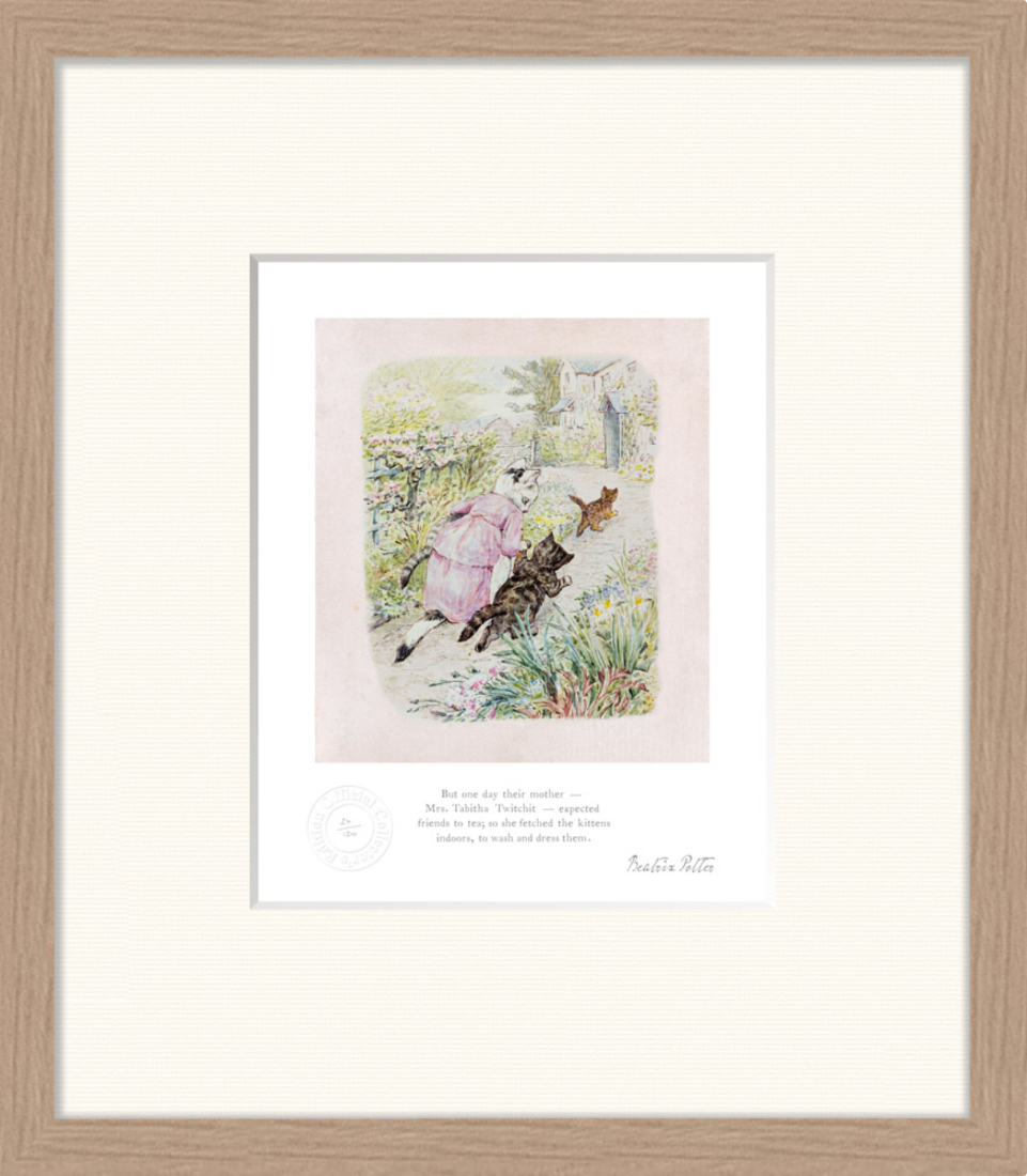 Tabitha Twitchit Fetched The Kittens Indoors by illustrator Beatrix Potter captures a scene from the book The Tale of Tom Kitten. Featuring Ms. Tabitha bringing the three small kittens back indoors from the garden. Loved by adults and Children alike, this Official Collectors Edition artwork makes a fantastic gift for a child's bedroom, or as a nostalgic piece ideal for a quiet reading space in your home.