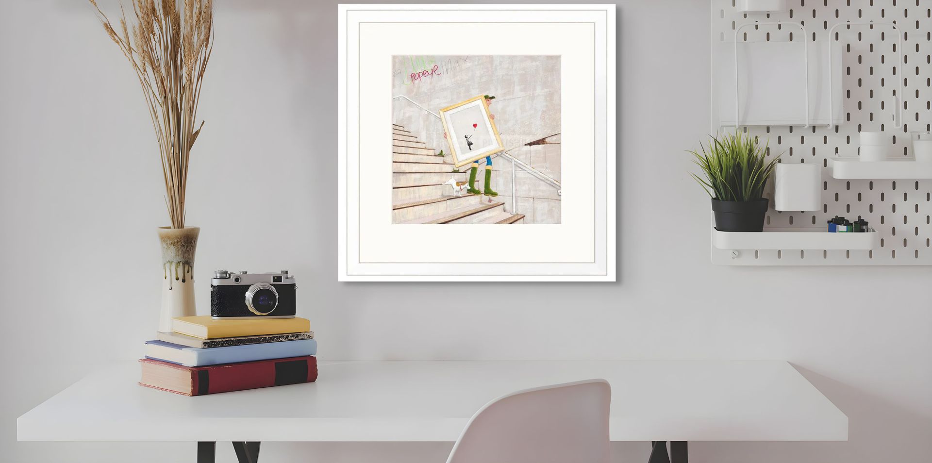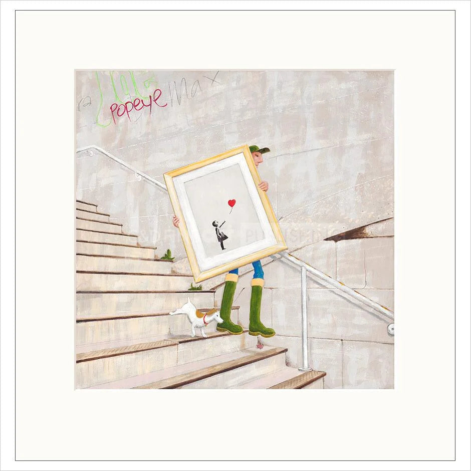 The Frame II by artist Chris Ross Williamson. The artwork features Chris' character creations - Garfield Eldritch and his faithful companion dog Barton Darcy. The duo carrying a Banksy gingerly down the steps All of Chris' works of art have a dedicated four line poem which accompanies the Certificate of Authenticity. The poem with this artwork reads:
