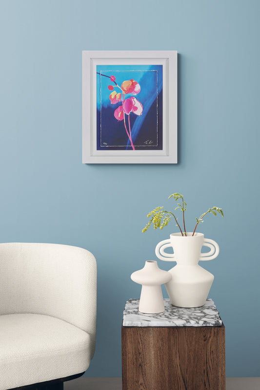 Ethereal features a rare and delicate orchid, rendered in a vivid and contrasting palette of glowing blues, deep navy, soft pinks, orange, and yellow. Released as a limited edition of just 95, it’s a captivating celebration of colour and form. Part of a stunning new trio of floral limited editions, this contemporary piece stands out on its own but becomes truly striking when paired with the other two works in the series. Tim Fowler uses a lively and eclectic style, combined with his vivid use of colour to create the stunning botanical and experimental works. With a signature palette of vivid hues, his work is recognisable and is a strong investment choice for collectors.