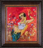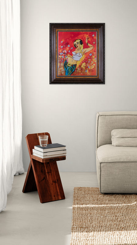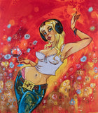 Paper Tiger by artist Todd White features a striking blonde female figure with music in her headphones, savouring a glass of red wine. Behind her, soft pastel flowers bloom against a warm, glowing backdrop of yellow, orange, and red. Todd White's witty and fun celebratory scenes use vibrant colours and bold patterns give these figures a character that is instantly recognisable, a fantastic investment for art collectors and investors alike.