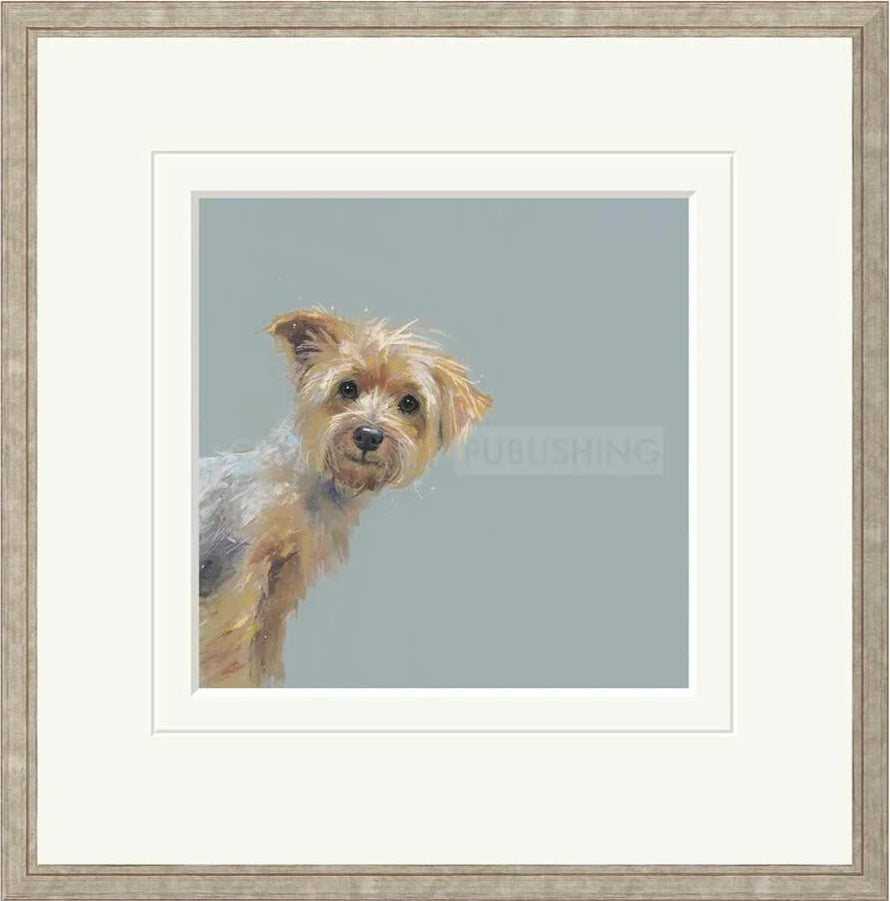 Yorkie by animal artist Nicky Litchfield captures a cute Yorkshire Terrier, popping his head out from the side of the artwork with an innocent look, on a blue grey background his shiny coat looks gorgeous. Nicky Litchfield is a talented British artist creating works of art using animals as her subject matter. Her work is characterised by coloured backgrounds with the animal often placed off centre which adds to the character and personality of the art.