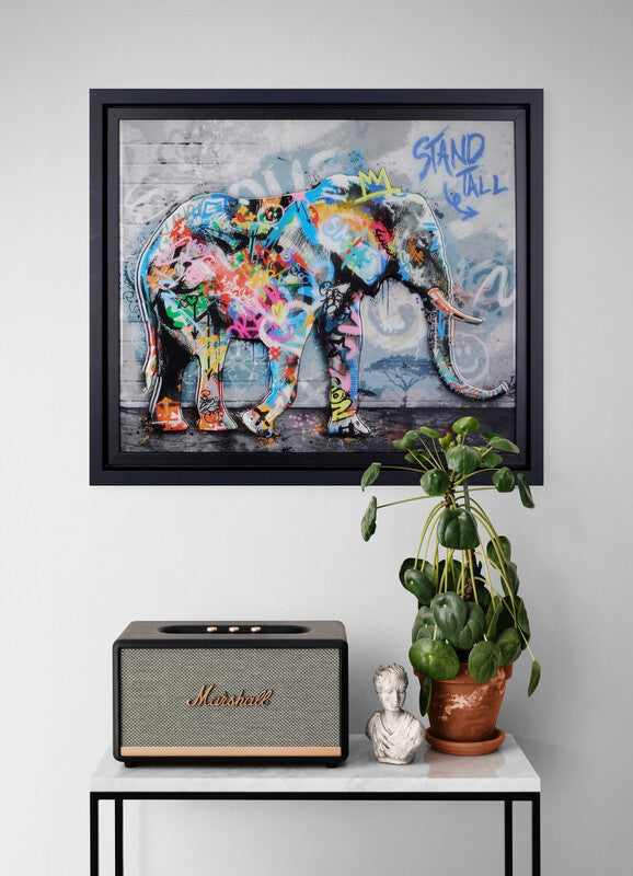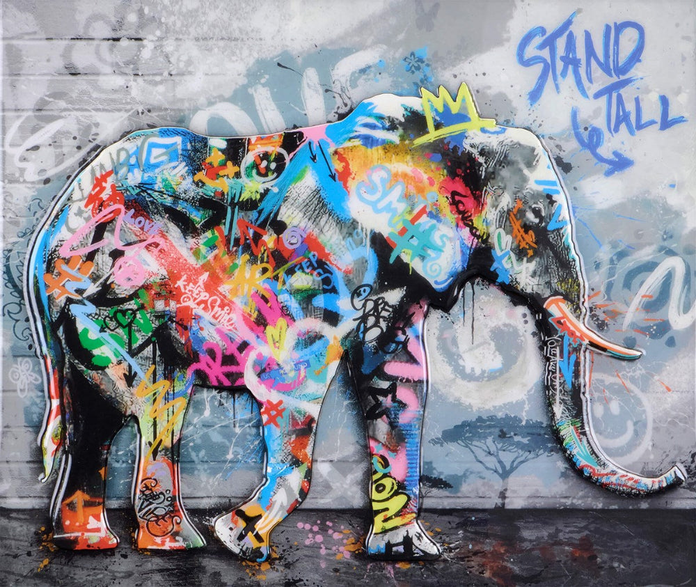 Stand Tall by artist Yuvi and presents a boldly painted elephant on a raised, cut-out panel set against a graffiti-inspired urban wall, giving the work a strong sense of immediacy while fusing Pop Art energy with the artist’s signature themes of strength and individuality. Presented in a sleek black contemporary frame and finished with a glossy resin surface. Yuvi uses a lively graffiti inspired by pop art, with energy and animates scenes from the urban environment his highly collectable work is contemporary and unique, a fantastic choice for investors and urban art enthusiasts.