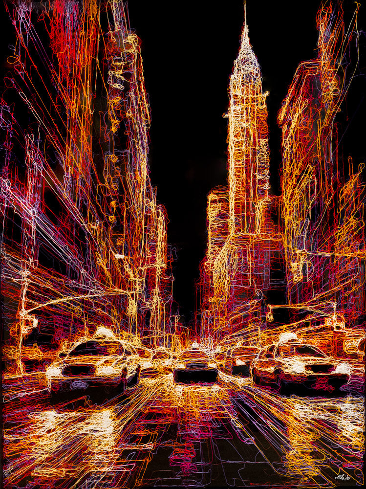 NYC Glow is a cityscape by artist, Zalini, captures the vibrant atmosphere of New York City at night, the city becomes a grid of light, with the exploding light from billboards the Empire State Building stands tall. Yellow taxis glow like moving embers, threading warmth through the city’s restless rhythm. This artwork is crafted with his new latest art technique, the Scribble Technique, with an ultra fine 3D pen innovated by Zalini himself, the layers of paint are built up to create a multi-layered portrait including a range of colours which visually and physically make the piece stand out against it's high gloss black background.